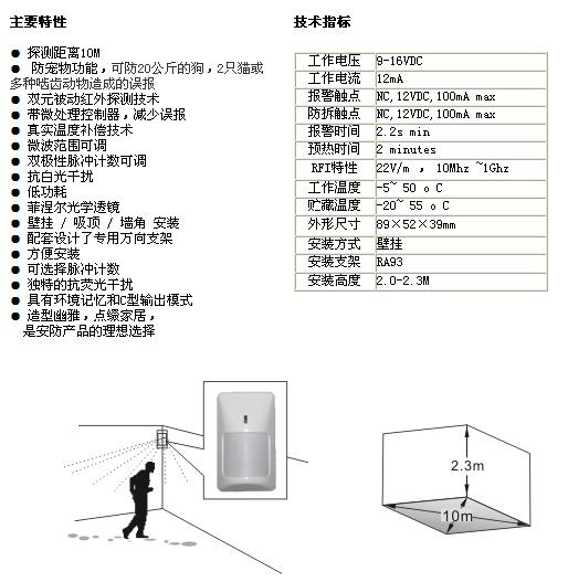 HC-9210PT双元红外被动移动探测器。防宠物型HC-9210PT探测器是专门设计用于家庭使用的,防范范围10M。具有信号捕捉能力强,误报、漏报率低,低功耗和真实温度补偿的特点。配专利菲涅尔光学透镜,抗白光干扰。产品技术含量 高、制作工艺考究、外观造型高雅。